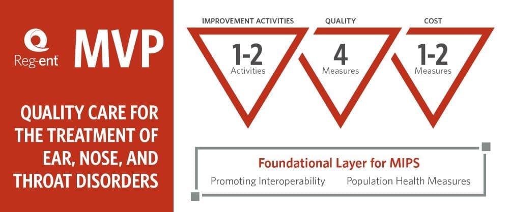 The Reg-ent team at the AAO-HNSF has codeveloped with CMS the MIPS Value Pathway focused on Otolaryngology, “Quality Care for Ear, Nose, and Throat” which was finalized as an approved MVP as outlined in the 2024 Medicare Physician Fee Schedule Final Rule. The MVP focuses on caring for patients experiencing some of the most common otolaryngology conditions such as otologic conditions, chronic rhinosinusitis (CRS), age-related hearing loss (ARHL) and otitis media. This MVP would be most applicable to Otolaryngologists and applicable Non-Physician Practitioner (NPPs) such as audiologists , nurse practitioners, and physician assistants.